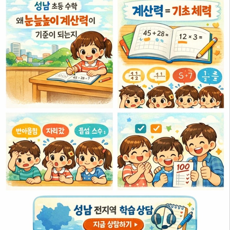 초등 수학의 진짜 기초, 눈높이 계산력이 왜 다른지 아이 수학이 흔들릴 때 대부분의 부모님은 이렇게 말씀하세요. “개념은 아는 것 같은데 계산이 너무 느려요.” “실수만 안 해도 점수가 훨씬 잘 나올 텐데요…” 그런데 사실, 이건 아이의 집중력 문제도, 노력 부족도 아닙니다. 계산 기초가 제대로 만들어지지 않았기 때문이에요. 계산력은 ‘속도’가 아니라 ‘기초 체력’입니다. 많은 문제집이 “빨리 풀어라, 많이 풀어라”에 집중합니다. 하지만 계산력은 속도가 아니라 정확하고 흔들리지 않는 기본기예요. 눈높이 계산력은 이 기본기를 이렇게 만듭니다. ✨ 단계별 반복 ✨ 패턴 인식 훈련 ✨ 암기 아닌 이해 중심 ✨ 하루 분량의 짧....... <img src="https://blogthumb.pstatic.net/MjAyNjAxMTNfMjg0/MDAxNzY4Mjg5NTc1MjYw.65iEHr7cCSJAeVDskhscqpv79_0tWgeXozACgjNXB1Mg.v8a7NtymIJzYQD3SX1w0zhz4LQV3AUatdzVTe0icULIg.JPEG/%B0%E8%BB%EA%B7%C2%C0%CC%B9%CC%C1%F6.jpg?type=s3" />