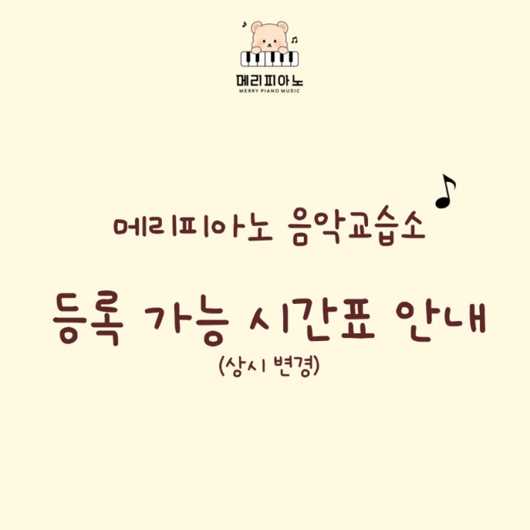 (현황에 따라서 가능 시간표가 변경되어짐을 안내드립니다) 메리피아노는 아이 한명한명의 안정적인 수업권을 위해 한타임에 지정된 인원을 수업하는 소수정예 레슨으로 운영됩니다. 원하시는 시간대 대기 남겨주시면, 추후 티오가 생길 시 상시 등록으로 진행가능하시며 본문 아래에 수업 가능 요일과 시간을 상시 공지드립니다. 찾아주시고 문의주셔서 진심으로, 깊이 감사드립니다♥ 항상, 더 깊이 있는 레슨으로 보답드릴 수 있도록 세심한 지도와 체계적인 수업으로 함께하겠습니다. 감사합니다 2026년 1월 기준 등록 가능 요일 및 시간 ✔️ 화요일 3:00 ✔️ 수요일 2:30 ✔️ 목요일 3:00 / 5:00 ❤︎ 메리 피아노 원....... <img src="https://blogthumb.pstatic.net/MjAyNjAxMDRfMzgg/MDAxNzY3NDg2ODY0MDAx.m-RJlyqZ92I4E8OJ1upjnjUPtgnrINHJZ2MMhAawk30g.93pQwJSRvwoHJQxMO2kYLTyjI6g5UkKyt1rptZEhb-4g.JPEG/900%A3%DF%C1%A6%B8%F1%C0%BB%A3%AD%C0%D4%B7%C2%C7%D8%C1%D6%BC%BC%BF%E4%A3%DF%A3%AD004.jpg?type=s3" />