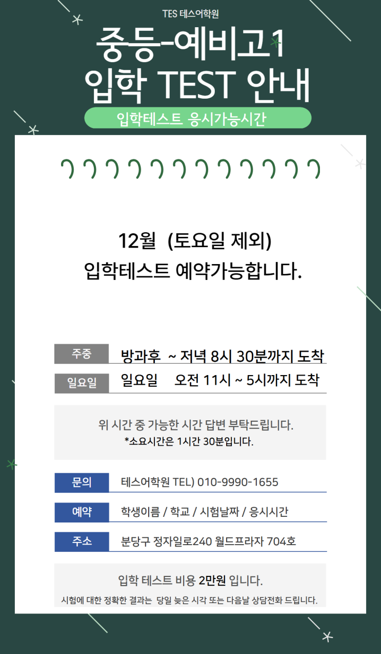 테스어학원 12월 입학테스트 (토요일 제외하고 예약가능합니다)