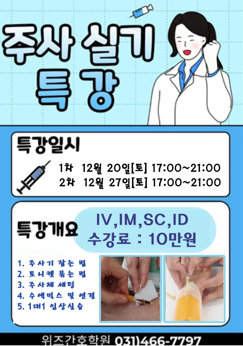 ** 12월 주사실무수업 특강일자 공지합니다 선착순마감입니다 간호주사실무특강 접수방법 1. 기업은행 117-208583-01-014 (이미혜 / 위즈간호학원) 10만원 입금 2. 성함/주민번호 앞자리/교육일 선택 후 010-3450-0167로 문자 남기기 3. 현금영수증 발행, 접수완료 <img src="https://blogthumb.pstatic.net/MjAyNTEyMDRfMTUz/MDAxNzY0ODMzMTU1NDgx.dXMNrLBSU2LWzqS5Hj_SgmpNGyPkiF6IIipw5mZplBog.Kl08pjiuJa3npKBvD0Z6WSQKurW8ba3QUKHv98xp9zYg.PNG/12%BF%F9_%C1%D6%BB%E7%BD%C7%B9%AB.png?type=s3" />