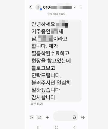 차이 안양 인테리어필름 학원 원장입니다ㆍ 본 원장은 필름 박사라는 블로그 활동을 하고 있습니다ㆍ 그 블로그를 방문한 타학원 수료생이 저한테 보낸 문자입니다ㆍ 의지는 좋지만 구직활동메 대한 개념이 부족한 내용입니다ㆍ 많은 경쟁자들이 구직활동을 하고 있습니다ㆍ 여러분은 구직활동을 어떤 방법으로 하려는지 훈련시간에 생각을 정리해서 발표하시기 바랍니다ㆍ <img src="https://blogthumb.pstatic.net/MjAyNTEyMTBfMTM2/MDAxNzY1MzQwNjQzODIw.h5gvsouqSV0QhRjgfhWEgdc9pf3g64f_DD66syEkdS0g.kGnwaKfu1Nu9snGdW-mhqx6lf2pjyseeEMx3J1FI4rMg.PNG/1765340371998.png?type=s3" />
