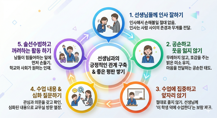 #부천 #상동 #국영수 #생기부 #1대1 #컨설팅 #뱅뱅프라자 #특목고 #자사고 #일반고 #수행평가 #독서 #논술 #수시 #석천 #상일 #부명 #상원 #중흥 #중원 #원미 #계남 #수주 #정명 #예비중 #예비고 #수능 #학교생활지침 공부이외에 학교생활에서 꼭 필요한 사항에관하여 특히 고등학생의 경우 매년 새학기가 시작하면 강조하는것들을 간단하게 이야기해보겠습니다. 아래의 내용은 학생의 소양과 발전을 위해서이기도 하고, 학생부기록을 위함이기도 합니다. 생기부 기록을 위한 목적을 가지고 접근하는것이라 생각하기보다는 진짜 학생의 발전을 위함이라고 생각하시는것이 더 좋겠습니다. 선생님들에게 인사잘하기 인사해서 손해볼일은 절대로 없....... <img src="https://blogthumb.pstatic.net/MjAyNjAzMDNfMjgz/MDAxNzcyNTM5NTY3MTUz.XpqSalHH2luxNVwB-Pzu_pGXuCTpIl2OSM0zWmS5ZU0g.aysu8XQo_tzRPT9FUmzEIBLP34ImvIbYiaB_EJZSnykg.PNG/Gemini_Generated_Image_k7i76jk7i76jk7i7.png?type=s3" />