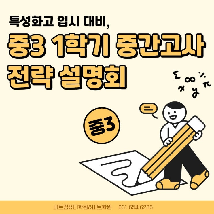 안녕하세요 평택특성화고전문학원 평택비트컴퓨터학원&비트학원입니다 :) 요즘 상담을 하다 보면, 중학교 3학년 학부모님들의 고민이 많습니다. 우리 아이 성적으로 고등학교 어디 갈 수 있을까? 인문계로 가는 게 맞을까? 아니면, 특성화고가 더 유리한 선택일까? 대학 진학은 가능할까? 간다면 어느 대학을 목표로 할 수 있을까? 취업은 할 수 있을까? 계속해서 같은 질문만 반복하고 계신 건 아닐까요? 이제는 막연한 불안 대신, 정확한 정보와 구체적인 전략이 필요합니다. 특성화고 진학 전략 설명회 중학교 내신별 고등학교 전략 중학교 내신으로 고등학교 진학 시 인문계고 / 특성화고 성적 비교 학교별 전....... <img src="https://blogthumb.pstatic.net/MjAyNjAyMjFfMTAz/MDAxNzcxNjQyNjQ5MzUy.-0CP2wznVTfNZRXjhGx1A9SpNsqbobOtGZZTG0Prd5Yg.0HhUZER4jhTwUyCWy2g3gFYx71VSzQL7ZzC2LlR8nSsg.JPEG/1.jpg?type=s3" />