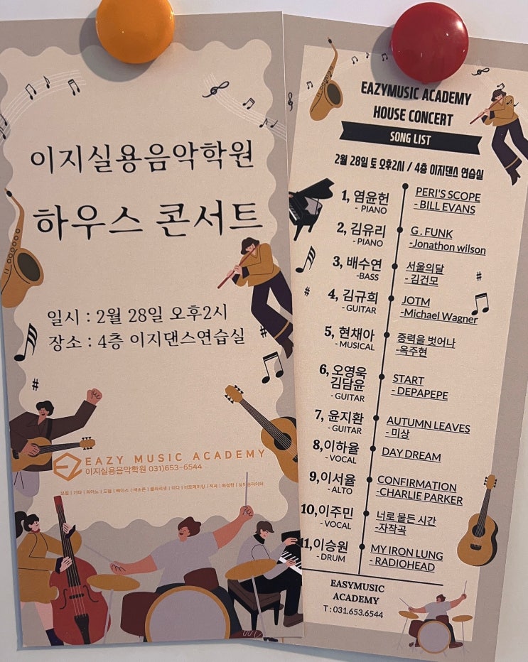 이지실용음악학원 하우스콘서트 이야기 지난 주말, 우리 학원에서 작은 하우스콘서트를 열었습니다. https://youtu.be/RAkXBMMfNfo?si=3Et9I42-4egKygZE 큰 무대도, 화려한 조명도 없었지만 서로의 숨소리와 손끝의 떨림까지 느껴지는 가장 진솔한 무대였습니다. 방학 동안 각자 열심히 준비해온 곡들을 한 명씩 연주하며 그동안의 노력과 성장을 직접 보여주는 시간이었어요. 무대에 서기 전의 긴장, 첫 음을 내는 순간의 집중, 연주가 끝난 뒤의 환한 표정까지. 실수보다 중요한 건 끝까지 연주를 마무리하는 힘, 그리고 음악을 즐기는 마음이라는 걸 아이들 스스로 느끼는 시간이었습니다. 특히 이번 콘서트는 단순한 발표회가 아니....... <img src="https://blogthumb.pstatic.net/MjAyNjAzMDRfMTU5/MDAxNzcyNjA0MzQ3MzQ0.U39qQ_OczPo_OQw8lsm5-hBiTQcy5O9x9oTN7E1ldzgg.yvuq-OFhu1bSP-244fdiiPqTHJs5JDtDRaeA7-NuFGQg.JPEG/IMG_0666.jpg?type=s3" />