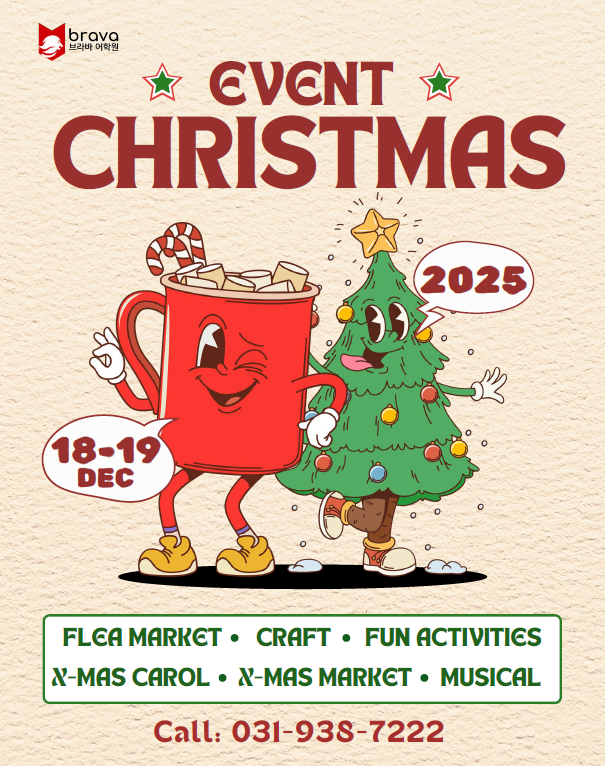 2025년 연말을 맞아 브라바어학원에 크리스마스 이벤트가 열렸어요~^^ 올해에는 브라바 친구들이 어떤 이벤트를 즐겼는지 함께 보실까요~? Carol 크리스마스를 맞아 브라바 친구들이 열심히 준비한 캐롤을 발표하는 시간을 가졌어요~! 자신있게 부르며 귀여운 율동도 함께 선보였는데요~ 그동안 연습한 실력이 빛나는 순간이었어요. 교실 가득 울려 퍼지는 캐롤로 크리스마스 분위기가 물씬 느껴졌답니다~! Musical 노래도 하고 연기도 하는 크리스마스 뮤지컬 활동 시간을 가져보았어요~! 조금은 긴장할 법도 한데 친구들 모두 끝까지 씩씩하게 해냈답니다. 대사, 춤, 표정 연기까지 정말 최고였어요~! 아이들 스스로 해냈다는 경험을 통해 영어....... <img src="https://blogthumb.pstatic.net/MjAyNjAxMDhfMzkg/MDAxNzY3ODcwNDAwNDIw.qFjbu4XZAwFtDHUFjulLYV-iJCmLxJgJNPiAI4VH-Kgg.9KN9fgGmnHaw_y70UeAI0NBuBfJdUNxOtBNF8HBfHIQg.PNG/%C5%A9%B8%AE%BD%BA%B8%B6%BD%BA_%C6%F7%BD%BA%C5%CD.PNG?type=s3" />