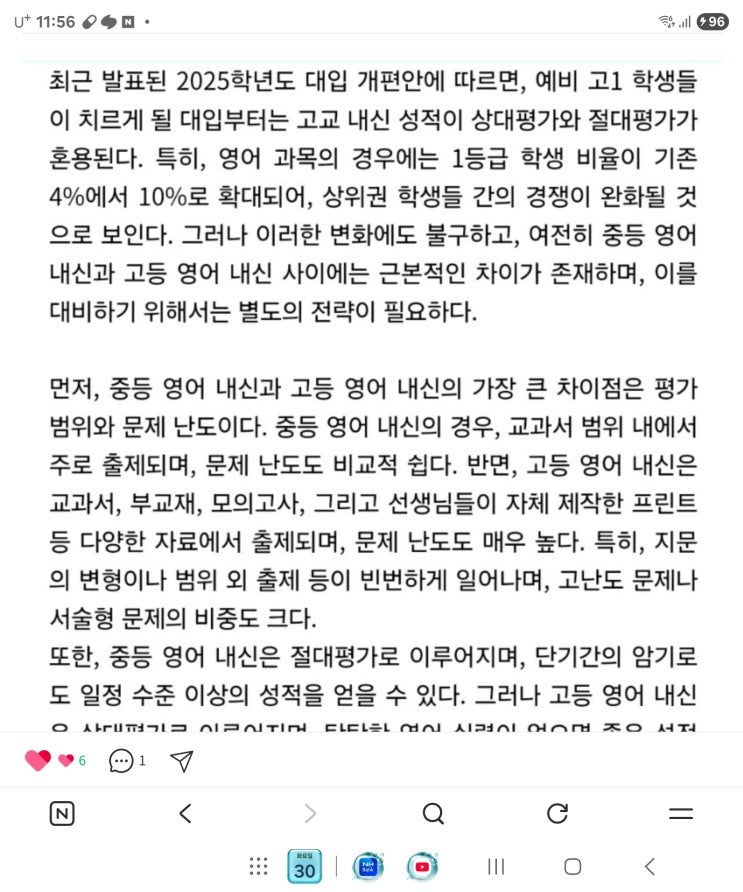 요즘 중·고등학교 영어 시험은 꾸준히 어려워지고 있습니다. 고등부는 이제 5등급제로 바뀌면서 등급의 폭은 넓어졌지만(상위 10프로 1등급) 실제로는 원점수 한두 문제 차이가 등급 전체를 갈라놓는 구조가 되었습니다. 특히 1등급 구간은 거의 무결점에 가까운 점수를 요구하기 때문에 (평균에 대한 원점수로 실제 수시에 점수반영 따라서 평균이 높을수록 원점수가 손해보는 현상으로 난이도를 쉽게 낼수 없는 현실) 중등부의 경우도 문제가 단순히 외워서 나오는 문제보다는 글을 요약하고 영어의 생각을 정리하여 대답하는 독해형 문제가 깊이 있게 나오고 있으며 이미 서술형 평가도 상당수 포함하고 있어 문법을 실제 문장형성에 적용해야....... <img src="https://blogthumb.pstatic.net/MjAyNjAxMjJfMTY2/MDAxNzY5MDUzNDU2MTQ0.7EM9ubk44nHbaDB9fprVsgxuJ_ZSNX549MyxYP5IGSIg.OahFB24kv6uT8gutl32zEUxK-OJsk73GM9dej0OdqS8g.JPEG/5%B5%EE%B1%DE%C1%A6%BF%A1%BC%AD_%BF%B5%BE%EE%B3%BB%BD%C5_%BC%BA%C0%FB_%B9%DD%BF%B5%BF%A1_%B0%FC%C7%D1_%BA%ED%B7%CE%B1%D7_%BC%A6.jpg?type=s3" />