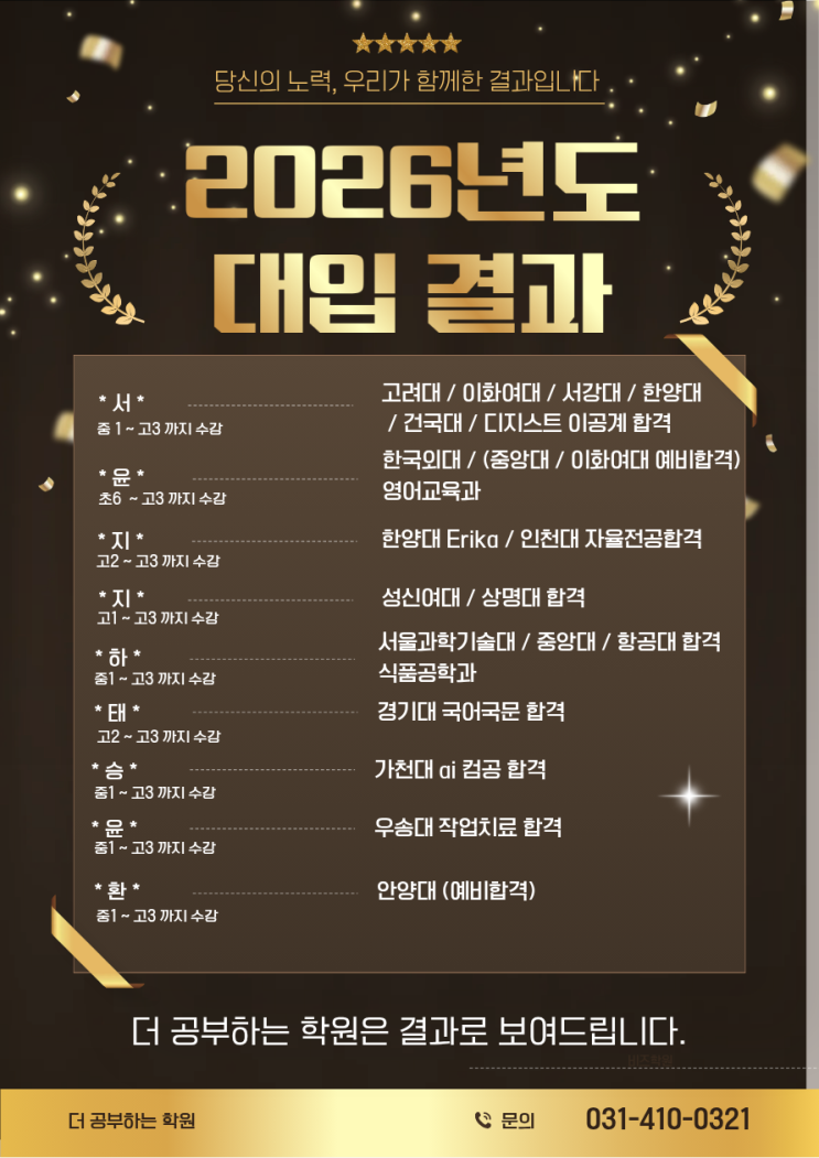 이번 대입에 더 공부하는 학원 목감 본원에서 9명의 고3 친구들이 도전해서 모두 합격하는 결과를 거두었습니다. ^^ 특히 *서* 학생은 지원했던 총 6개 학교 중 5개 대학에 현재 합격통보를 받은 상태이고, 연세대 추가 합격자 발표를 기다리고 있습니다. 그동안 공부하느라 고생했던 학생들 진심으로 축하합니다. 앞으로도 계속해서 좋은 결과를 얻을 수 있도록 더공부하는학원에서 최선을 다하도록 하겠습니다. <img src="https://blogthumb.pstatic.net/MjAyNTEyMThfMTUg/MDAxNzY2MDU2MjA2MDcx.aXAWEjb9N2s-rCO4eLdljYjYNV2vbdDcvpCIFnGzaVgg.ogekOBRoT-J_RPs50rpWBYxmpHbpgxzqnxwro_WcUKYg.PNG/%C1%A6%B8%F1%C0%BB_%C0%D4%B7%C2%C7%D8%C1%D6%BC%BC%BF%E4._%283%29.png?type=s3" />