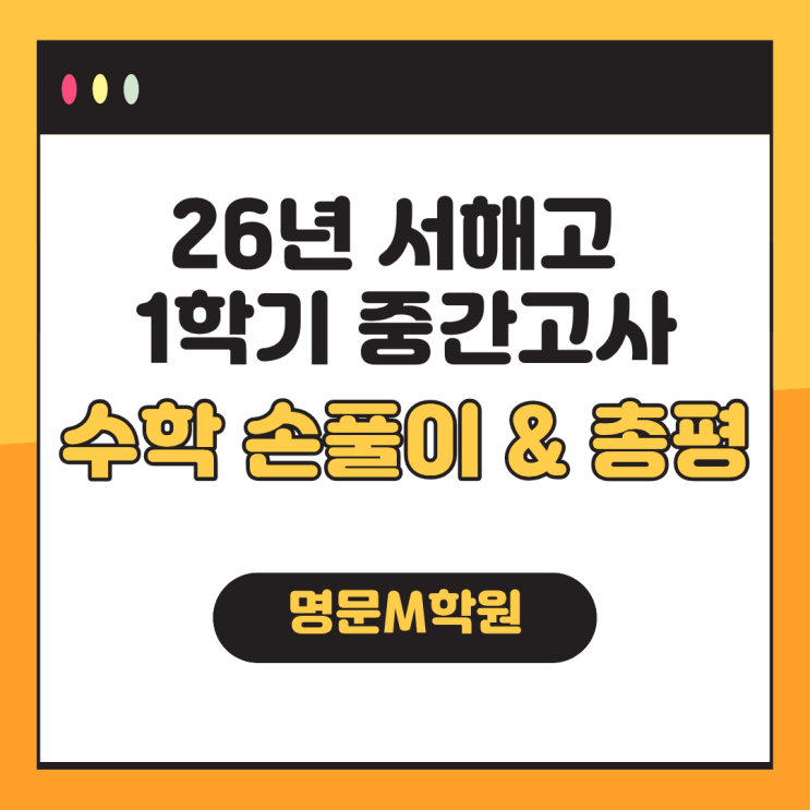 2026년 서해고 3학년 1학기 중간고사 미적분 손풀이 2026년 서해고 3학년 1학기 중간고사 미적분 총평 *난이도 및 변별력 작년 기출과 비슷한 수준으로 전형적인 문제들로 출제. 1등급 커트라인 90점대 *출제유형 및 변형 교과서 및 유형서 출제 70% 킬러문항 없음. 2026년 서해고 2학년 1학기 중간고사 대수 손풀이 2026년 서해고 2학년 1학기 중간고사 대수 총평 *난이도 및 변별력 전체 난이도 '중상' 동학년 작년 시험이 쉬웠던 터라 아이들의 체감 난이도가 높았을 것으로 추정. *출제유형 및 변형 교과서 및 유형서 출제 14문제 모의고사 변형 문제 출제 4문제 킬러문항 18번 무료 상담 및 테스트 예약 _레벨테스트 후 금요....... <img src="https://blogthumb.pstatic.net/MjAyNjA0MjFfMjAw/MDAxNzc2NzUxOTI0NzAx.b2bjEWqwkOe7kYZYt2Jwt6b9C0G3CDicEnNekTVTHX4g.IXBHLRMAURq3OXrObYyLHDXmFqODrIm-ULuNOipdt-og.PNG/%C1%A6%B8%F1%C0%BB_%C0%D4%B7%C2%C7%D8%C1%D6%BC%BC%BF%E4._-_2026-04-21T151200.211.png?type=s3" />