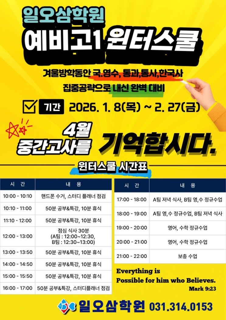 고등학교 1학년의 공부 근육을 키우고 있는 일오삼 예비고 1 친구들^^ 하루 종일 힘들겠지만 열심히 하고 있어서 기특하고 대견합니다!!! 1월 2월에 공부 근육키우느라 힘들었지만 3월부터 그동안 공부한것들이 빛나기 시작할꺼라 조금만 더 힘내라고 예비고1친구들에게 박수를 보냅니다. #장곡고 #능곡고 #시흥고 #서해고 #함현고 #소래고 #고등학교1학년준비 #고등1학년영어 #고등1학년수학 #고등1학년국어 #고등1학년3월모의고사준비 <img src="https://blogthumb.pstatic.net/MjAyNjAyMTJfMjg5/MDAxNzcwODg5MTMxODQ3.WWUL-yDEj5ULtOFiAtlHFl2lyTGqRRnpLM3_bLNAN8wg.o_JypePIlJFik48_nKqd32tF7jmp8y-TLvv8mMuOiTYg.JPEG/Resized%A3%DF1767159332153.jpeg?type=s3" />