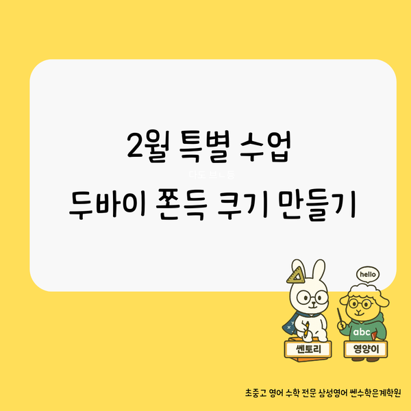 Dubai chewy cookies are very popular in Korea. 안녕하세요. 삼성영어쎈수학 은계학원의 달님쌤입니다. 설 연휴를 앞둔 2월 13일, 아이들과 함께 특별한 영어 수업을 진행했습니다. 바로 요즘 SNS에서 핫한 ‘두바이 쫀득쿠키 만들기 특강’ 입니다. 아이들이 좋아하는 것에서 수업이 시작됩니다 요즘 아이들 사이에서 가장 인기 있는 간식 중 하나가 바로 두바이 쫀득쿠키죠. 달님쌤 교실에서는 아이들이 좋아하는 핫한 트렌드를 수업으로 연결합니다. “재미있다 → 관심이 생긴다 → 몰입한다 → 학습 효과가 높아진다” 이 흐름이 가장 중요하거든요. 달님쌤 교실만의 쉬운 버전! 정석적인 두바이 쿠키는 과정이 조금 복잡해서 이번 특강에....... <img src="https://blogthumb.pstatic.net/MjAyNjAyMTVfMzEg/MDAxNzcxMTY0NzAwMzEw.JIbd0yD0lhJ1_GwBwyB0dii45Rex_yjmhZHqhRupwHog.mE2VAq-1FaTq4YFtf4fJZyhjvya2W5J09vENkS2Eds4g.PNG/Yellow_coming_soon_Instagram_post_%283%29.png?type=s3" />