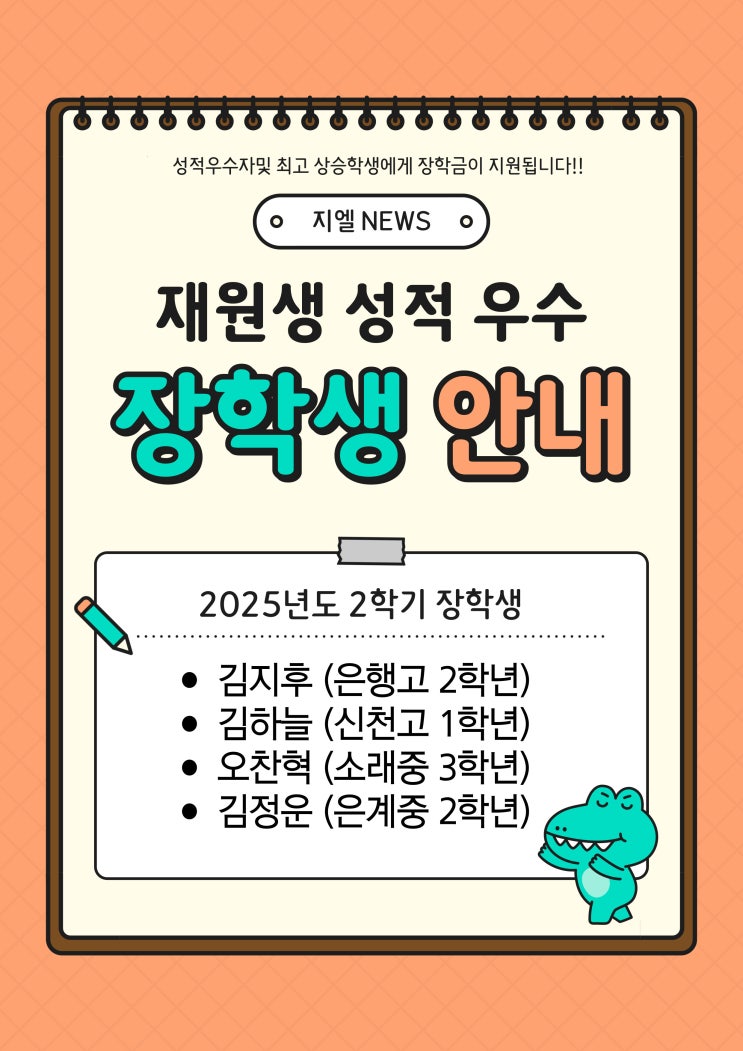 안녕하세요. 지앨학원입니다. 설연휴는 즐겁게 보내고 계신지요? 가족들과 함께 행복한 시간 보내시기를 기원합니다^^ 지엘학원에서는 매 학기마다 장학생을 선발하여 소정의 장학금을 지원하고 있습니다. 학생들에게 학업에 대한 동기부여가 되고 한번 더 목표를 향하여 정진하는 기회가 되기를 기대하는 마음으로 2025년 2학기 성적장학생을 안내드립니다. 다가오는 새학기도 응원합니다. 화이팅!! <img src="https://blogthumb.pstatic.net/MjAyNjAyMThfMjY5/MDAxNzcxMzc4OTQ3NDQ1.qDvUWXh69Eb6erqtHBlbII4wPaLdwC5Ws1WD8y152lQg.QLfwLPKWWMaaFahvNdlqa7oNaA1L27me0c5s3_uA5Jsg.JPEG/2025%B3%E2-2%C7%D0%B1%E2-%C0%E5%C7%D0%BB%FD%B0%F8%B0%ED.jpg?type=s3" />