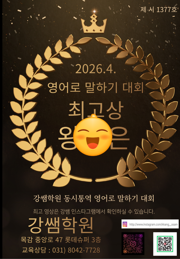 2026년 4월 강쌤학원 동시통역 영어로 말하기 발표회 최고상 축하합니다.