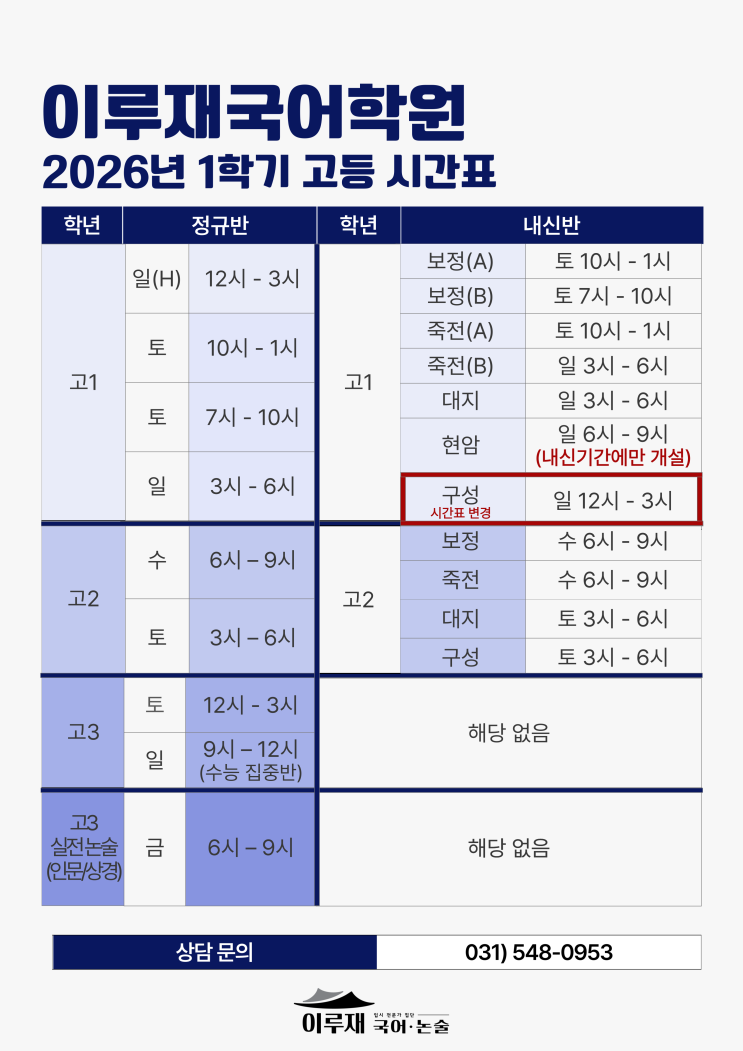 안녕하세요, 이루재 국어·논술입니다. 다가오는 새학기를 맞아 정규 시간표와 학교별 내신반 시간표를 안내드립니다. 구성고 내신 수업 시간이 변경되었습니다. 기존 시간과 다르므로 반드시 별도 안내된 변경 시간표를 확인해 주시기 바랍니다. 중간고사 잘 치르시고, 좋은 결과 얻으시길 진심으로 응원합니다. 감사합니다. <img src="https://blogthumb.pstatic.net/MjAyNjAzMDFfMTAz/MDAxNzcyMzQ1NjY4NzQx.DwgY9KcyjWKrdE_HrDjKGhqgNi2bXhyCvCp_WVUVBM0g.dG3akwD188dnv_AIljTXhD02dN_WitQqinCXx43HxU0g.PNG/002.png?type=s3" />