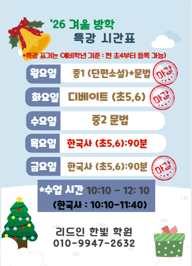 안녕하세요. 리드인 한빛 학원입니다. ’25 겨울방학 특강 접수가 마무리 단계에 접어들고 있습니다. 원래 한국사 특강은 한 팀만 운영할 예정이었으나, 학부모님들의 요청이 있어 한 반을 추가 개설하려고 합니다. (현재 2명 대기) 최소 인원 4명이 접수하면 개강하겠습니다. 그리고 매일 독서 10시 타임은 마감되었습니다. 예비 중2 문법 특강이 1/14(수) 오전 10시 10분에 개강 예정입니다. 중학생들이 특히 어려워하는 국어 문법을 차분히 익히고, 문법에 익숙해질 수 있는 시간을 마련해 주세요. 또한 지난주 12/10에 한국능력검정시험 결과가 발표되었습니다. 한빛학원에서는 10명의 학생이 응시해 전원 합격이라는 좋은 결과를 거두었습니....... <img src="https://blogthumb.pstatic.net/MjAyNTEyMThfMjM1/MDAxNzY2MDY4NzEwMTg3.N3xE7lPBs80RXjg4824OhuEsARnTbouwiPQXZustuykg.3jIEOhzGp6EVnDEae_XIc-lfLheV050YO_akWnO2fl8g.PNG/image.png?type=s3" />