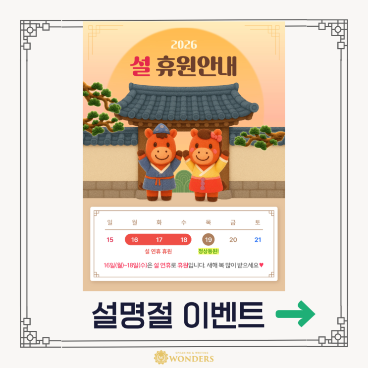 안녕하세요? 동천동 원더S 영어학원입니다. 2026년 설명절 학원 휴강일 안내드립니다. 정규수업 : 2/16-18 휴원합니다. 오전 특강 - 다음주 모두 수업 없습니다. 확인 부탁드립니다. 2026 설 명절 뽐내기 이벤트 그리고 명절 뽐내기 예전과 같이 올해도 이루어집니다. 지난번 뽐내기 영상들도 보여드릴께요^^ https://blog.naver.com/wonders_edu/224050281955 https://blog.naver.com/wonders_edu/223757725600 제기차기 이벤트 영어뽐내기도 너무 좋은데 아이들이 가족과 함께 즐거운 시간을 보내면 좋을 듯 해서 준비한 이벤트 입니다 ^^ 가장 많은 갯수로 제기차기 성공한 영상을 채널로 보내주세요! 3가족에게는 치킨 선물을 보내드립니다 ㅎ....... <img src="https://blogthumb.pstatic.net/MjAyNjAyMTFfMjc4/MDAxNzcwODAxOTkzNzkw.JiNnGkZqSQ7EAhfLd0KqMEa0EsiEronLu4uoLCfGhksg.JN1Iov_crTG-QZj27RSLsUCzA9MZeIEbVzoRgMtgHKUg.PNG/%C5%A9%B8%B2%BB%F6_%B1%F2%B2%FB%C7%CF%B0%ED_%C0%FC%C5%EB%C0%FB%C0%CE_%C7%D1%B1%B9%C0%FC%C5%EB%B3%EE%C0%CC_%BC%D2%B0%B3_%C4%AB%B5%E5%B4%BA%BD%BA_%282%29.png?type=s3" />