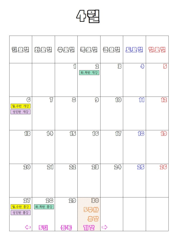 4월 수업일정 및 5월 등록기간 안내