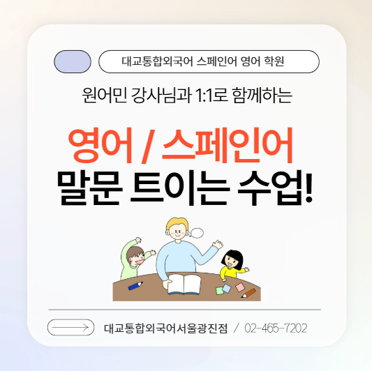 안녕하세요! 건대 영어회화학원/ 스페인어 학원 대교랭퀴지스퀘어 광진점입니다! 요즘 어학 공부, 시작은 했는데 말이 안 나와서 답답하다는 분들 정말 많죠. 특히나 바쁜 직장인, 대학생, 성인 학습자분들이 짧은 시간 안에 실전에서 바로 써먹을 수 있는 ‘진짜 회화 실력’을 쌓고 싶어 하시는데요. 저희 학원은 그런 여러분을 위해 1:1 또는 소수 정예 회화 회화 수업을 진행하고 있습니다. 탄탄한 기초를 바탕으로 입이 트이게 하는 ‘실전 회화’ 수업을 소개해 드릴게요! 저희 건대 영어회화학원/ 스페인어 학원에서는 학습자 개개인의 필요에 딱 맞는 수업을 설계해 드려요. 모든 수업은 원어민 강사님이 수업을 직접! 알려드립니다. 때....... <img src="https://blogthumb.pstatic.net/MjAyNjAxMDdfMjAz/MDAxNzY3NzIzMjI2NzEx.2re7yu_yML1yH5wIj2Q8Jgru64DgBoh7EV4g5yHxXREg.Z8oBU0P6cyu0DPSEw0BoTP-W4dlKBpNAPyMnjSh3eGAg.PNG/image.png?type=s3" />