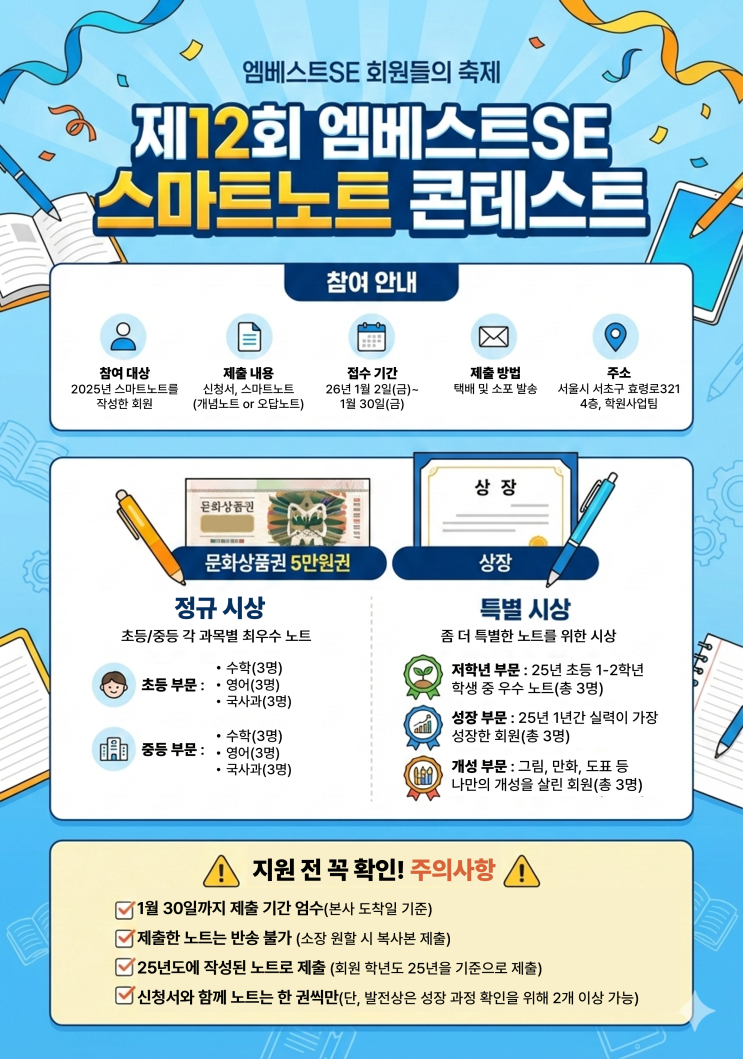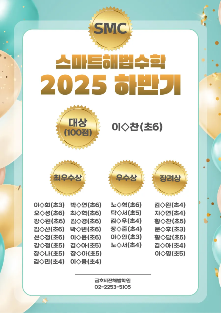 안녕하세요~^^ 금호동 비전 해법학원입니다. 조금 늦은 감이 있지만 25년도 하반기 SMC 후기를 적어보려고 합니다. 연말연시라 특강준비로 워낙 바쁘다보니 이제야 짬을 내었습니다. SMC는 해법수학 학원에 다니는 친구들을 대상으로 보는 2학기 총괄평가입니다. 보통은 학원에서 2학기를 마무리하며 치뤘는데 올해는 특별히 중부지사 주재하에 한양대학교에서 진행했습니다. 외부시험인지라 조금 더 긴장하고 진지해진 울 친구들^^ 하지만 실력은 실력대로 나오는 법! 모두 수고 많았고!! 이런 소중한 경험을 바탕으로 새학기 수학공부에 더욱 전념하기를 바랍니다^^ 크리스마스 파티날 선물과 상장과 메달을 받고 기뻐하는 친구들과 인증샷!!^^....... <img src="https://blogthumb.pstatic.net/MjAyNjAxMTJfMTA0/MDAxNzY4MTk2NTY0NDEx.Sb4HGSye6m4EiRTc9ijt076fVFwzlhkkp0sB0MYESh0g.uCweZkkGjFCFsXMwLXWleY0pHzBi3ny3_viDe4GjFSgg.PNG/900%A3%DF1767950780638.png?type=s3" />