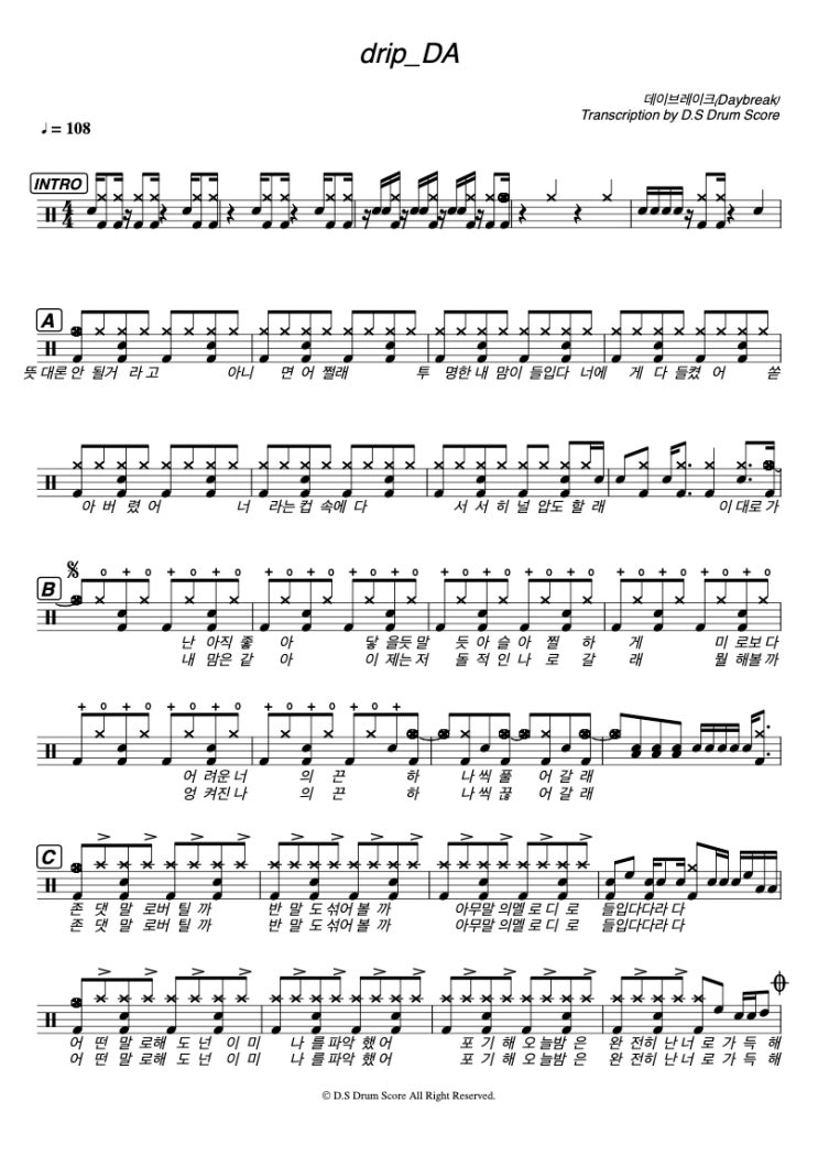 안녕하세요 디에스 음악교습소입니다 ! 안녕하세요 오늘은 데이브레이크의 신곡 drip_DA 입니다. 악보 제작문의를 주셔서 곡을 들어봤는데 주체할수없는 신남..(?)으로 영상까지 만들게 되었습니다. 어마어마한 섹션들과 싱코페이션의 향연입니다. 전체적으로 원곡이랑 조금 다르게 해석을 해보았습니다. 원곡에서 B,C 파트는 하이헷으로 연주되었지만 B파트에 오픈하이헷을 이용한 디스코 리듬과 C파트에 라이드 벨로 N박에 강세를 살려보았습니다. 그리고 엔딩은 페이드아웃이라 끝날때까지 Outro를 계속 연주해주시면 됩니다. 즐거운 연습 되시길 바랍니다 :) < 드럼악보는 링크참조 > https://www.fullscore.co.kr/shop/prd_view.php?p....... <img src="https://blogthumb.pstatic.net/MjAyNjA0MTNfNzgg/MDAxNzc2MDQ0ODYzODQy.r-o48c2aYnY3WwjMalX0KWSO-ERUwqUEdDttsA5Auyog.CK08NXV6oHWr3Vtc1eeJ1SjG_JlL1CmQqCVIcZ8TVU0g.JPEG/drip_DA_%B9%CC%B8%AE%BA%B8%B1%E2.jpg?type=s3" />