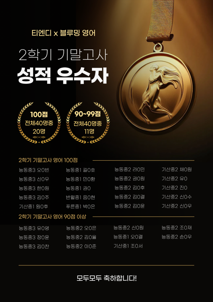 [능동중 영어학원] 행복한 25년 2학기 기말고사 중등부 시험 결과! [푸른중 영어학원] [기산중 영어학원]