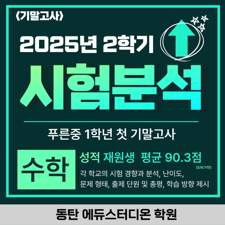 안녕하십니까 중.고등 내신/입시 전문 동탄에듀스터디온 학원입니다. 2025년 푸른중 1학년 2학기 기말고사 첫 시험이 마무리되었습니다. 중1 학생들에게는 푸른중학교에 들어와 치른 첫 시험이었습니다. 첫 시험이어서 많이 긴장되고 낯선 시험 환경과 범위에도 불구하고, 이번 1학년 2학기 기말고사에서는 100점과 90점 이상 성적을 받은 학생들이 다수 배출되었습니다. 너무 기특합니다.^^ 그 이유에는 ㅣ 동탄에듀스터디온 학원이 사전에 정리해 둔 핵심 개념과 대표 유형이 실제 출제와 높은 비율로 맞물리며, 시험 대비 적중률이 분명히 드러난 시험이었습니다. 이는 단기적인 요령이 아니라, 교과서·프린트(부교재) 중심으로 출제 흐름을 기....... <img src="https://blogthumb.pstatic.net/MjAyNTEyMTlfMTYx/MDAxNzY2MTE2MjU4MDIy.HkFxDR3Mz7G_QGFMqDziQ-snNpJ6sXgI-6RIx8qKvHMg.e6Uuapr7fe3iO997KwjMhfcUcNQM1Qs_IEnewxta0UQg.JPEG/%C1%A6%B8%F1%C0%BB-%C0%D4%B7%C2%C7%D8%C1%D6%BC%BC%BF%E4_-001_%2814%29.jpg?type=s3" />