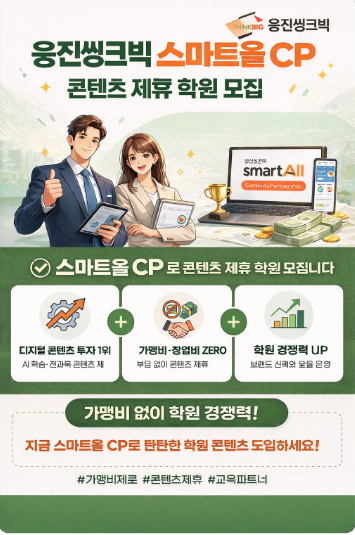 웅진씽크빅 스마트올 CP 파트너 모집 가맹비 없이 시작하는 콘텐츠 제휴, 지금 가능합니다 학원 운영, 이제는 콘텐츠 경쟁력이 전부입니다. ✔ 학부모 상담에서 차별화가 어렵다 ✔ 전과목 커리큘럼 구성에 부담이 있다 ✔ 강사 의존도를 줄이고 싶다 ✔ 디지털 학습 시스템을 도입하고 싶다 이 고민을 해결할 방법이 있습니다. 바로 웅진씽크빅 스마트올 CP(Content Partnership) 입니다. 스마트올 CP란? 스마트올 CP는 웅진씽크빅의 AI 기반 학습 콘텐츠를 학원·공부방·교육기관과 제휴하여 활용하는 모델입니다. 단순 교재 공급이 아닙니다. AI 진단 기반 맞춤 학습 예비초~중등 전과목 커버 데이터 기반 학습 관리 시스....... <img src="https://blogthumb.pstatic.net/MjAyNjAyMTNfMTg3/MDAxNzcwOTc0NDk2Nzg5.aK9IUaHMKT_rCBfC27wU9SJnkEZT4Z1sLmb1dFZ74LEg.jacnjZKz7q9HP-d_Hm1uEWxjHC1MFVR187Oq0pdLsAgg.PNG/image.png?type=s3" />