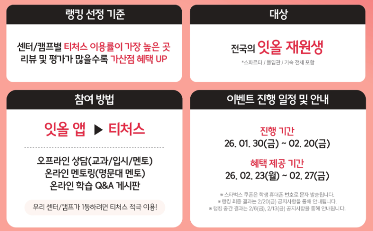 안녕하세요 잇올스파르타 수원 영통센터 1관입니다! 오늘은 티처스를 많이 이용하면 어떤 혜택을 받는지 안내해드릴려고 합니다~ ● 랭킹 선정 기준 ● 센터/캠프별 티처스 이용률이 가장 높은곳 리뷰 및 평가가 많을수록 자산점 혜택 UP ● 대상 ● 전국의 잇올 재원생 *스파르타 / 몰입관 / 기숙 전체 포함 ● 참여 방법 ● 오프라인 상담(교과/입시/멘토) 온라인 멘토링(명문대 멘토) 온라인 학습 Q&A 게시판 우리 센터/캠프가 1등하려면 티처스 적극 이용! ● 이벤트 진행 일정 및 안내 ● 진행기간 2026년 1월 30일 금요일부터 2026년 2월 20일 금요일까지 혜택 제공 기간 2026년 2월 23일 월요일부터 2026년 2월 27일 금요일까지 *스타....... <img src="https://blogthumb.pstatic.net/MjAyNjAyMDVfMjQ1/MDAxNzcwMjQ4OTc4NTg3.YJRCSj7pDM4KqaSQ9wlhgYhQUerouGJo2UdbJUpAItsg.5C1ge1E87Q0RQD5iMfdOPIvcho_D7x8XVISu-qiXW9wg.PNG/image.png?type=s3" />