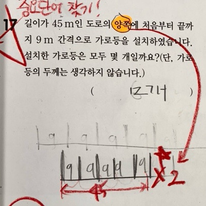 1. 양쪽에 가로등이 3m 간격으로 세워져 있다’는 문장에서 아이들이 가장 많이 놓치는 것은 “양쪽”과 “3m 간격”의 의미입니다. 많은 학생들이 ‘3m마다 하나씩’이라는 말만 보고 바로 계산을 시작합니다. 하지만 여기서 중요한 건, ✔️ 한쪽만인지, 양쪽인지 ✔️ 시작점과 끝점이 포함되는지 ✔️ “간격”인지 “개수”인지 이 세 가지를 정확히 구분하는 것입니다. 수학은 계산 싸움이 아니라 조건을 정확히 읽어내는 싸움입니다. ‘양쪽’이라는 한 단어를 놓치면 정답과는 멀어질 수밖에 없습니다. #2. 자주 틀리는 유형 연산은 정확했지만, 문제에서 요구한 답을 찾지 못한 경우 학부모님들이 가장 아쉬워하시는 부분입니다. “계산....... <img src="https://blogthumb.pstatic.net/MjAyNjAyMTFfMjU3/MDAxNzcwODE5MDI5Nzc5.V0IbUYBff4cf8Hx_EolIxkyt1ODwfWvKcjhHeTDks50g.RA2gfIPOBqf5LmKPnyHd_MapQhY7FYRXrvOhCMhZlVsg.JPEG/output%A3%DF2459703123.jpg?type=s3" />