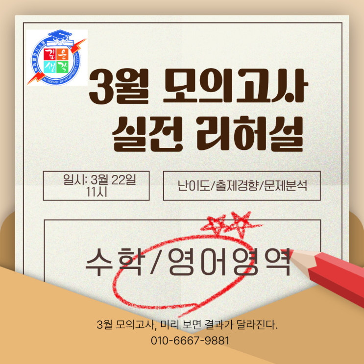 3월 모의고사, 미리 경험해 보면 결과가 달라집니다 3월이 되면 고등학생들에게 가장 먼저 찾아오는 시험이 바로 3월 전국연합 모의고사입니다. 하지만 많은 학생들이 시험을 제대로 경험해 보지 못한 상태에서 처음 시험을 보게 됩니다. 그래서 시험장에서 이런 이야기를 많이 합니다. “시간이 부족했어요.” “생각보다 긴장이 됐어요.” “문제를 풀 순 있었는데 시험 분위기가 낯설었어요.” 사실 실력만큼 중요한 것이 시험 경험입니다. 시험은 경험한 사람이 훨씬 유리합니다 모의고사는 단순히 문제를 푸는 시험이 아닙니다. 실제 시험과 같은 환경에서 ✔ 시간 관리 ✔ 문제 풀이 순서 ✔ 긴장감 속 집중력 을 경험하는 것이 중요합니다....... <img src="https://blogthumb.pstatic.net/MjAyNjAzMTNfNDMg/MDAxNzczMzg2NDAwNTAx.eJ6MB0wNOm-VQ1Xj2WE1L8NfYp0WakT-QhsCfHMJ7u4g.jeYbjb_BNKo90nOSfmpZhrFXIts0pJZlKzvRVWjI21gg.PNG/%C1%A6%B8%F1%C0%BB_%C0%D4%B7%C2%C7%D8%C1%D6%BC%BC%BF%E4._%285%29.png?type=s3" />