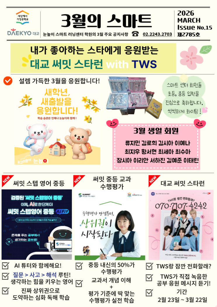 안녕하세요. #장평초 #은석초#동대부중 #장평중 학부모님들 ~ 눈높이 스마트 러닝센터 학원입니다. 새학년 새학기가 시작된 지 한 주가 지났습니다. 모두들 학교 생활에 잘 적응하고 있나요? 새롭게 초등학교, 중학교에 입학한 우리 스마트 회원들 너무 너무 축하하고, 여러분의 성장을 항상 응원합니다. 시작하는 달, 3월의 스마트 소식을 전합니다. 대교 써밋 스타런 : 공부하기 힘들지? TWS가 응원하는 써밋 학습, 같이 할래? 매일 해야하는 공부, 학년이 올라갈수록 늘어만 가는 학습량, 힘든 친구들 모두 모여라! TWS가 응원할게! 써밋 학습하면서, TWS 굿즈 받자! 6개월 완주하면 단독 팬미팅 응시권도 증정됩니다. 3월 22일까지 070-7107-....... <img src="https://blogthumb.pstatic.net/MjAyNjAzMTNfMjk2/MDAxNzczMzY3NzE5ODg2.8g9S6dvxW_b5-xyNetc7b6xvArY34OAycuCL_6i49zwg.T5JOIE2EZ3mNlg2mjwYrIjZ009xbXqCVUEapIIA7Skcg.PNG/%BD%BA%B8%B6%C6%AE.PNG?type=s3" />