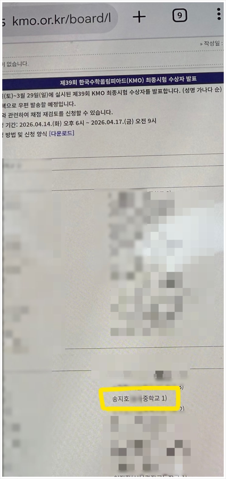 생각하는 황소 졸업생 송지호 학생이 한국 수학 올림피아드(KMO)에서 장려상을 수상했습니다. 황소에서 기른 수학적 사고력이 큰 무대에서도 빛을 발했습니다. 지호 학생의 수상을 진심으로 축하합니다. <img src="https://blogthumb.pstatic.net/MjAyNjA0MjFfMTMw/MDAxNzc2NzY1NzMxNTMy.NJghBFuDBf2A39ARsGfv-tybxyn5RCBEvUJENeskAeEg.nMwxtA3AvABN79mr41DISKmUax7Wi5AqeWA4ms_Uilcg.JPEG/1.jpg?type=s3" />