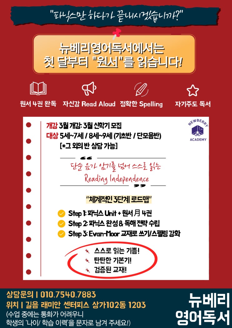 안녕하세요. 길음동 뉴베리영어독서입니다 새로운 시작의 설렘이 가득한 3월, 우리 아이의 첫 영어 단추를 어떻게 끼워줄지 고민하고 계신가요? "파닉스만 하다가 시간 다 가는 건 아닐까?" "언제쯤이면 아이 스스로 책을 읽을 수 있을까?" 이런 고민을 하고 계신 학부모님들을 위해, 뉴베리에서는 첫 달부터 진짜 '원서'를 읽는 3월 신학기 신입생을 모집합니다! 뉴베리의 수업은 단순한 암기를 넘어, 아이들이 "스스로 읽는 기쁨(Reading Independence)"을 느끼게 하는 데 집중합니다. 특히 Evan-Moor(에반무어) 교재를 활용한 체계적인 학습으로, 읽기 실력뿐만 아니라 정확한 스펠링과 쓰기 실....... <img src="https://blogthumb.pstatic.net/MjAyNjAyMDZfMTU3/MDAxNzcwMzQzNTA5MDIz.XN-BIgfixdCAmUjBbmPzX1fL1vTyg-xT9b9cPwohFLwg.Yoh3YV5HeCOY6Ksh4f5mOw014-sol8555YmyXjUBDvgg.JPEG/KakaoTalk_20260130_145110976.jpg?type=s3" />
