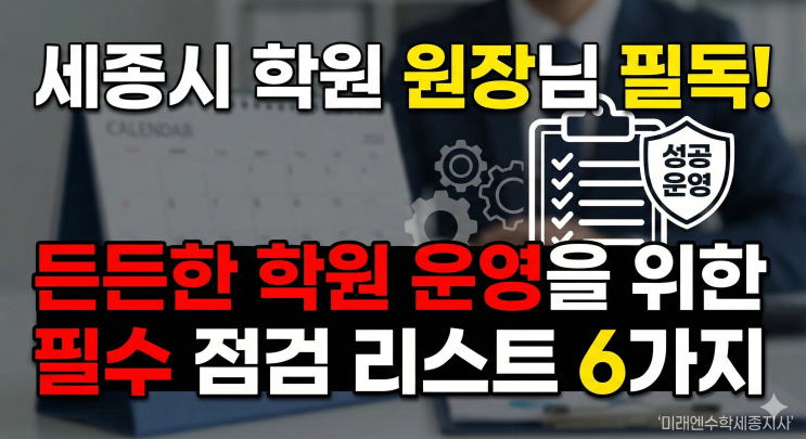 원장님, 잠깐! ✋ 따뜻한 차 한 잔이 생각나는 계절입니다. 우리 원장님들, 아이들의 성장과 빈틈없는 학원 운영을 위해 오늘도 눈코 뜰 새 없이 바쁜 하루를 보내고 계시죠? 학원을 운영하다 보면 수업만큼이나 중요한 것이 바로 '운영 규정 준수'입니다. 자칫 놓치기 쉬운 부분이지만, 학원의 신뢰도와 직결되는 만큼 꼼꼼한 점검이 필수랍니다. 오늘은 세종시교육청의 가이드를 바탕으로, 원장님께서 꼭 확인하셔야 할 운영 체크리스트를 정리해 드립니다. 잠시 짬을 내어 따뜻한 커피 한 잔 하시면서 하나씩 체크해 보세요! 1. 학원 게시물, "내·외부"에 모두 있나요? 학원에 들어서면 가장 먼저 보이는 게시물들, ....... <img src="https://blogthumb.pstatic.net/MjAyNTExMzBfNzEg/MDAxNzY0NDg5NDEzNTky.wfxBDWeBD0PG8fqQa-sCn_jz0xXBLfZ3BGm_40fsQuwg.wdSe6QjlbdvLqnXYxB4Xx7a3AoJJFrTKzWwEinnpI-sg.PNG/Gemini_Generated_Image_gm0smggm0smggm0s.png?type=s3" />