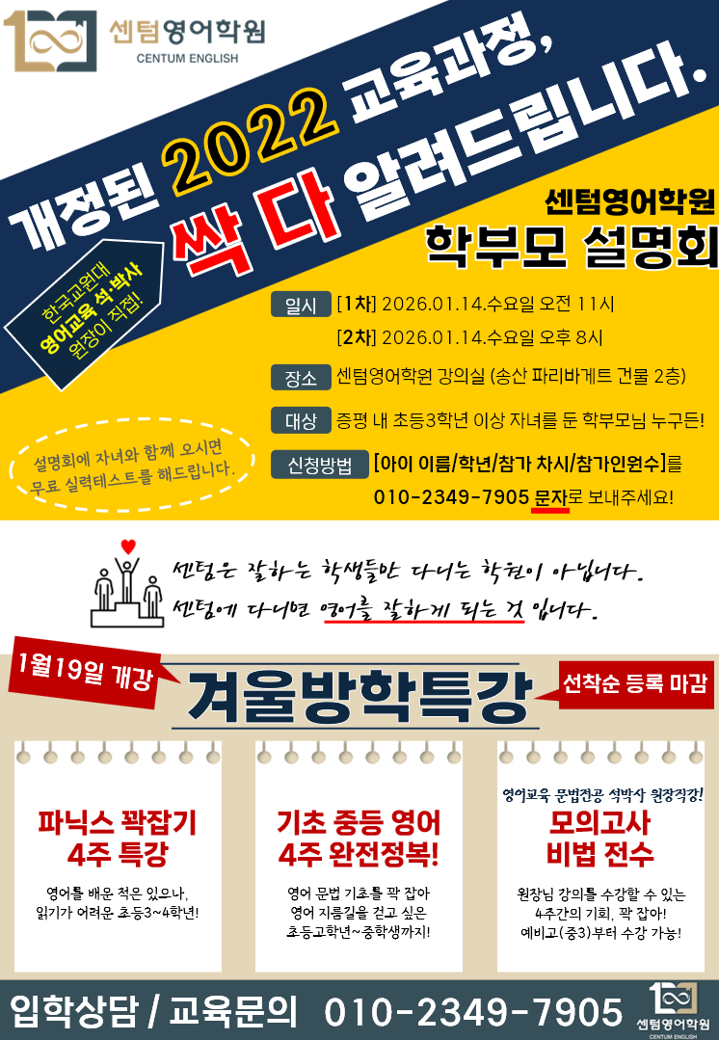 안녕하세요. 증평영어학원 윤선생영어교실 Tr 오클리 입니다. 지난주 첫 눈도 내리고 어느새 2학기도 얼마 남지 않아 곧 겨울방학이 시작되는데요. 지금부터 초중고등학생들의 겨울방학 계획 알차게 준비해야 할 때입니다. 전환기를 맞는 예비초등부터 중고등학교로 입학하기 전 겨울방학은 아주 중요합니다. 이제 곧 중학생인데 중학영어와 수행평가 준비 어떻게 해야할까요? 2학년부터 학습지로 파닉스를 했는데 아직 단어 쓰기는 어려워해요 요즘 이런 고민으로 저희 증평영어학원 윤선생영어교실에 상담을 많이 해주시는데요. 대부분 전환기룰 맞는 예비초등부터 예비 중학생 학부모님의 공통적인 고민거리입니다. 국공립학교에서는 초등 3학....... <img src="https://blogthumb.pstatic.net/MjAyNTEyMTdfMTQy/MDAxNzY1OTM3NTM3MjM1.HRzvLK2PLADPIeeZ_j-4T0WdsZ1bMNdjZM3N8AMN-oUg.0pNwLiUs3wTDP9WNcbzsRU0BxQGJHKf67MpfafQOVwsg.JPEG/900%A3%DF1765937536589.jpg?type=s3" />