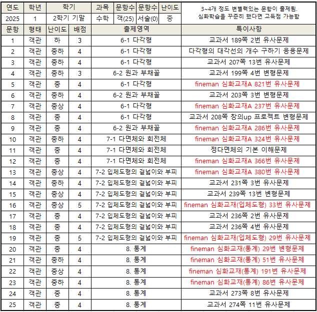 ★ 위 표는 유사출제가 중복된 경우, 교과서 > 학교 프린트 > 파인만 내신교재 순서로 기재했습니다. 2025년 광희중 1학년 2학기 기말고사 수학 시험은 객관식만 25문항으로 출제 되었으며 서술형은 따로 없었지만 다소 문항수가 많았고 변별력이 있는 문항들이 중간고사때보다는 많이 있어서 체감 시간은 다소 부족하다고 느껴지는 시험이었습니다. 우선 시험에 대한 주요 포인트를 정리해보면, ☆ 1) 중간고사 때보다 난이도가 소폭 상승했다. 중간고사 때보다 변별력이 있는 문항이 다소 늘었고 상대적으로 난이도가 있는 단원들이 시험범위에 포함되었으며, 시험범위도 한단원 정도 늘어서 공부할 양이 많았습니다. 또한 변형된 기출 베....... <img src="https://blogthumb.pstatic.net/MjAyNTEyMTdfMTgy/MDAxNzY1OTUyNTg4Mjc0.pkqGqydBcwvvIRZ7yvoxMa09vFkjECWTy1OfoUJbKCog.181ICGPm8PWTjvba19rE5zfp_rgrjJPXRjNBILP5Ofsg.PNG/image.png?type=s3" />