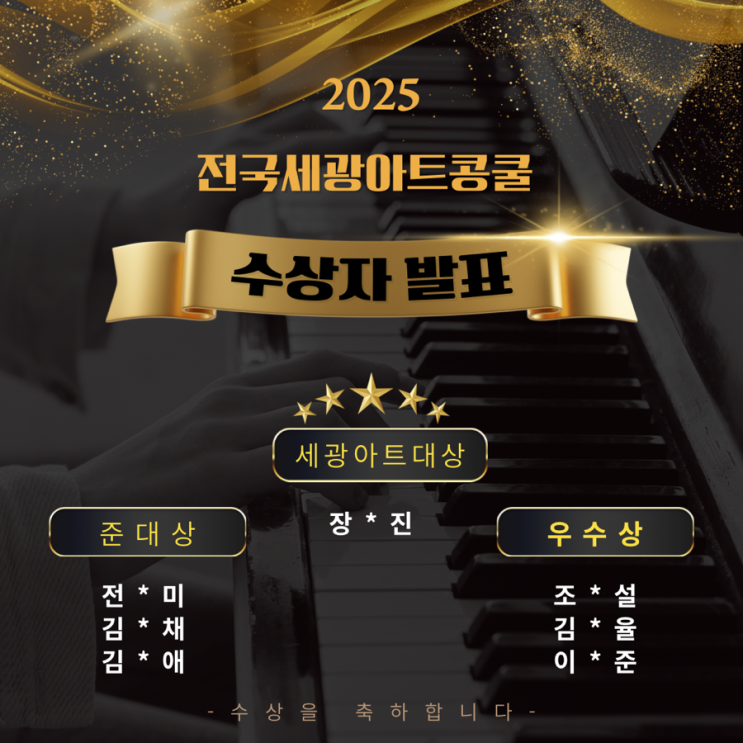 안녕하세요 나무에음악학원입니다! 2025년 9월 6일 열린 전국세광아트콩쿨에서 저희 나무에음악학원 학생들이 무려 전원 수상이라는 놀라운 성과를 이뤘어요! ✨ 이번 콩쿨에서는 세광아트대상 1명(장*진) 준대상 3명(전*미, 김*채, 김*애) 우수상 3명(조*설, 김*율, 이*준) 총 7명의 친구들이 멋지게 이름을 올렸답니다! 정말 박수 백 번 쳐주고 싶어요! “결과보다 중요한 건 아이들의 경험!” 이번 콩쿨 준비 기간은 약 3개월! 원장님은 아이들에게 늘 이렇게 이야기하셨습니다. “상은 보너스! 콩쿨이라는 특별한 환경에서 연주해보는 경험이 훨씬 값지다!" ✨ 정말 그렇듯, 낯설고 조용....... <img src="https://blogthumb.pstatic.net/MjAyNTEyMTBfODgg/MDAxNzY1MzU2Mjg1Mjgy.6ARYszeQg-yJ8WvHzOKdLDa2F-vgBXDT53kYt7GOyz0g.C2PN1uBrFQM75pfBL09bq2W0C5361-nX2JMq5HoQ9rcg.PNG/%B1%DD%BB%F6_%B0%CB%C1%A4%BB%F6_%C8%AD%B7%C1%C7%D1_%B0%ED%B1%DE%BD%BA%B7%AF%BF%EE_%C7%C7%BE%C6%B3%EB_%B4%EB%C8%B8_%BC%F6%BB%F3%C0%DA_%B9%DF%C7%A5_%C0%CE%BD%BA%C5%B8%B1%D7%B7%A5_%B0%D4%BD%C3%B9%B0.PNG?type=s3" />