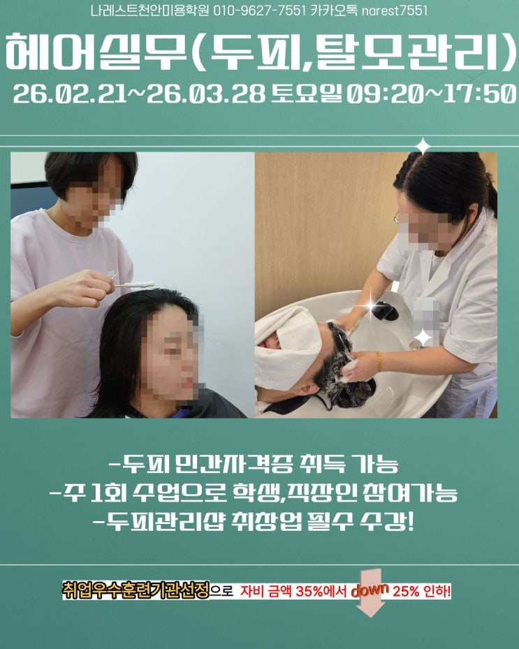 안녕하세요 나레스트천안미용학원 입니다. 탈모는 단순히 머리카락이 빠지는 문제가 아니라, 두피 환경이 무너졌다는 신호이기 때문에 조기 관리가 무엇보다 중요합니다. 헤어실무(두피,탈모관리) 26.02.21~26.03.28 토요일(주1회) 09:20~17:50 두피관리사 과정의 강점 ✔ 1. 현장 중심 커리큘럼 실제 사례 위주의 두피 스캔, 유형별 진단, 케어 방법을 실습하여 “바로 상담 + 시술할 수 있는” 실무 능력을 키웁니다. ✔ 2. 트러블 원인 분석 능력 강화 탈모·각질·유분 과다·민감성 등 문제 두피가 발생하는 구조적 원인을 이해하고 개인 맞춤 솔루션 제안까지 배웁니다. ✔ 3. 최신 두피 기기 & 제품 사용법 스케일링, 고주파, 이온....... <img src="https://blogthumb.pstatic.net/MjAyNjAyMDVfNDMg/MDAxNzcwMjg1NDgwMTIz.wsHjTKhKupw6mkMR7KXEllbDdkUhXDhL_MdvCe27y98g.Kd-Kd1RquoCHal2fzFoUv_n6A7OemaYxvt5k_YmDCBAg.JPEG/%C1%A6%B8%F1%C0%BB_%C0%D4%B7%C2%C7%D8%C1%D6%BC%BC%BF%E4._%2850%29.jpg?type=s3" />