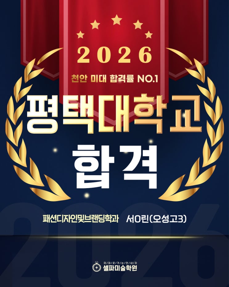 안녕하세요 천안 입시미술 불당셀파미술학원입니다 : ) 2026학년도 실기고사가 마무리 되었습니다! 역시 기대를 저버리지 않는 셀파 친구들! 좋은 결과들이 많이 들려옵니다. 최선을 다한 셀파 학생 여러분 수고 많았어요 축하합니다 션디자인조형자유전공학부 - 서O린 학생(오성고3) 축하드립니다 평택대학교 합격을 축하합니다. 셀파 친구들 모두 수고 많았어요~ 합격을 진심으로 축하합니다! . . . ✔️27년 경력 입시전문 천안 미술학원 디자인&애니셀파 ✔️개인별 맞춤 입시 ✔️대학별 입시 유형 세분화 입시반(고3, 예고) / 예비반(고1, 고2) 초·중등반(예고입시준비, 취미반) 수업 중 ▼셀파미술학원 인....... <img src="https://blogthumb.pstatic.net/MjAyNjAyMTFfMjU3/MDAxNzcwNzY5NzkwNTk1.eLLvAXNbHxiUaae7l0-6ezNeuKgaSq79_QeWWkL3sU8g.QXlDCPxYAeB7jdp39KrRLn___yxbJo2KoyiTXdxJ94sg.JPEG/%C6%F2%C5%C3%B4%EB.jpg?type=s3" />
