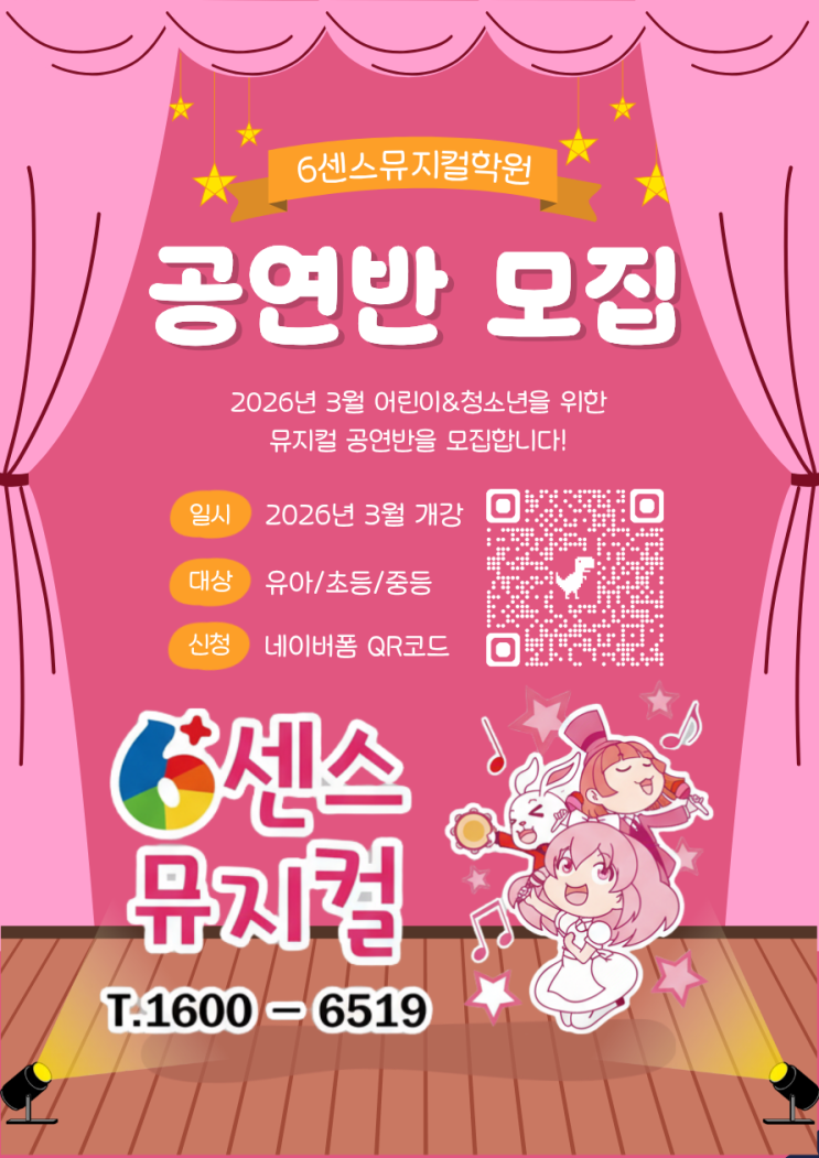 아이의 무대가 시작됩니다! 새 학기를 앞두고 우리 아이에게 특별한 경험을 선물하고 싶으신가요? 노래하고, 연기하고, 무대 위에서 빛나는 시간 ✨ 6센스뮤지컬학원 공연반에서 2026년 3월 개강을 앞두고 어린이 & 청소년 공연반을 모집합니다. 공연반은 이런 수업이에요 ✔ 뮤지컬 전문 트레이닝 (노래 · 연기 · 안무) ✔ 실제 무대를 목표로 하는 체계적인 수업 ✔ 자신감 · 발표력 · 표현력 향상 ✔ 협동심과 사회성까지 자연스럽게 성장 단순 취미 수업이 아닌, 무대를 완성하는 경험을 통해 아이의 가능성을 키워가는 과정입니다. 모집 안내 개강일 : 2026년 3월 대상 : 유아 / 초등 / 중등 신청방법 : 네이....... <img src="https://blogthumb.pstatic.net/MjAyNjAyMTNfOTIg/MDAxNzcwOTY1ODMxNjky._jAoGiXvSA_8_xC0QCwObz4MBthartbDS_a99sRCLjwg.uKgRZx77pzmEy2GpMabVt0g_r5SUe44eDFBR1G4emh0g.PNG/%C1%F8%C2%A5%C3%D6%C1%BE.png?type=s3" />