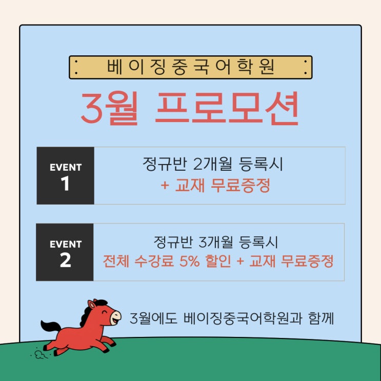안녕하세요. 천안중국어학원 베이징 인사드립니다 -! 모두들 즐거운 점심식사 하셨나요? 오늘은 오후부터 눈이 내리기 시작하네요. 봄기운이 성큼 찾아오려고 하는지 갑자기 날씨가 추워지고 쌀쌀해졌어요. 오전 오후 기온차가 매우 심하니 감기 조심하시길 바랍니다. 오늘은 천안중국어학원 베이징에서 3월 시간표를 소개해드릴게요. * 3월 신규수강생의 경우 레벨테스트 후 ‘신규 개강반’ 또는 ‘기존 수업 진행반’ 中선택 * ★ 정규 시간표 안내 ★ 화목반 : 3월3일(화) ~ 3월26일(목) (8회) 월수반 : 3월2일(월) ~ 3월25일(수) (8회) 월수금 : 3월2일(월) ~ 3월27일(금) (12회) 주말반 : 3월7일(토) ~ 3월28일(토) (4회) ★ 수강료 할인혜....... <img src="https://blogthumb.pstatic.net/MjAyNjAyMjRfMjQx/MDAxNzcxOTA3NTUwMDY4.p8tfV9kabc2D5dNdO9Mij6xFccTtAmczcJ7FMVYoF3Eg.n8ku67SNpi-w3teQpeYo1UaXr6RjaYkL_4FunqyG97cg.JPEG/%C1%A6%B8%F1%C0%BB-%C0%D4%B7%C2%C7%D8%C1%D6%BC%BC%BF%E4_-009.jpg?type=s3" />