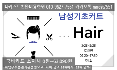 안녕하세요 나레스트천안미용학원 입니다. 26.02.28~26.03.28 토요반 주1회 09:20~17:50 남성기초커트를 국비로 배우고 싶지만, 어디서 시작해야 할지 고민하고 계신 가요? 같은 국비 과정이라도 교육의 깊이와 결과는 전혀 다를 수 있습니다. 그래서 소개합니다. 천안에서 제대로 배우는 남성기초커트, 차별화된 실무 중심 교육기관, 천안나레스트. 왜 지금, 남성기초커트인가? 최근 미용 시장은 빠르게 변화하고 있습니다. 특히 남성 고객의 비율이 꾸준히 증가하면서 남성전문 바버샵과 맨즈헤어샵이 늘어나고 있습니다. 단순히 머리를 짧게 자르는 것이 아니라, 트렌드와 두상에 맞춘 정교한 커트 기술이 요구되는 시대입니다. 하지만 많은 초....... <img src="https://blogthumb.pstatic.net/MjAyNjAyMjRfMjk0/MDAxNzcxOTE3MDQ2NjM3.JZ-3aFP-7Rl0ZhWZg0PlkVxc9ApGeA3mnWHDEEQOXpMg.e5dc0klQdttWdmFRzsrL4-ah2S0WwQr36NQ12eijwh4g.PNG/%C1%A6%B8%F1%C0%BB_%C0%D4%B7%C2%C7%D8%C1%D6%BC%BC%BF%E4._%282%29.png?type=s3" />