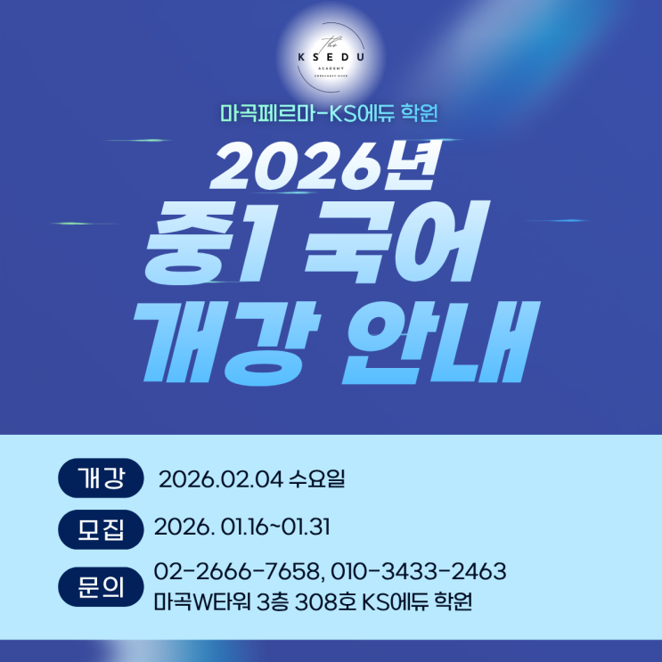 안녕하세요. KS에듀 학원 입니다^^ 오늘 가져온 소식은 KS에듀 학원 중1 국어 정규반 "개강 소식" 입니다! 작년까지 초등학교 6학년이었던 학생들은 올해 모두 중학교 1학년이 됩니다. 중학생부터는 본격적으로 학업에 신경을 써야하고 또, 초등학교 땐 치르지 않았던 중간/기말고사를 봅니다! 미리미리 잘 준비해놓는 친구들이 시험에서도 좋은 성적을 받겠죠? 2026년 학업을 잘 준비할 수 있도록 KS에듀학원에서 중학교 1학년 학생들을 위해 중1 국어 정규반을 개설합니다! 시간표 / 수업 안내 <개강일 안내> 모집 기간: 1/16~1/31 개강일: 2026년 2월 4일 수요일 정규반 수업은 기본적으로 주2회 총 3시간 수업(180분)입니다....... <img src="https://blogthumb.pstatic.net/MjAyNjAxMTZfNjgg/MDAxNzY4NTUzNzQ4MTk1.F31HZ9EG8k7AMksMwGufTq3pKFa3BucLM_b93ZFScjcg.kuRtVCXbgX8SSvQyvQ0F42gKLHPQTb_w4bTGeCupDlwg.PNG/1.png?type=s3" />
