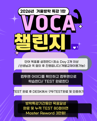 이번 방학 동안 단어 실력을 확실히 끌어올리기 위해 ‘단어 2배 챌린지’를 진행합니다. 평소 대비 단어량 2배 하루 암기 시간도 충분히 확보 목표 달성 시 상품권 환급 단기간에 단어를 ‘안다’ 수준이 아니라, ‘시험에서 바로 쓰는 수준’까지 만드는 것이 목표입니다. 단어 챌린지는 문법 특강과 함께할 때 효과가 가장 큽니다. 아는 단어가 많아질수록 문장 해석과 문법 이해 속도가 눈에 띄게 달라집니다. 세부 방법은 꼭 선생님과 상의하여 개별 미션을 확인하고 완료하는 과정을 만들어가겠습니다. 의미있는 겨울방학을 만들어가요!! 신청방법 : 1월 말까지 3주간 단어 미션 설정 (선생님과 목표설정 확인) / *챌린지 참가비 별도 * 기....... <img src="https://blogthumb.pstatic.net/MjAyNjAxMTFfMjUy/MDAxNzY4MTM5OTU1MzQ3.UfyQIT1IP3X2TltrOPlQiEJyy-Tc72-7r_J1tgE60DIg.ZJdc0c46HjfU5dZB18QrJ72D0QD0D1IP6T-DyIDzZZsg.PNG/%B4%DC%BE%EE%C3%A7%B8%B0%C1%F6%B5%B6%B7%C1%C7%CF%B1%E2.png?type=s3" />