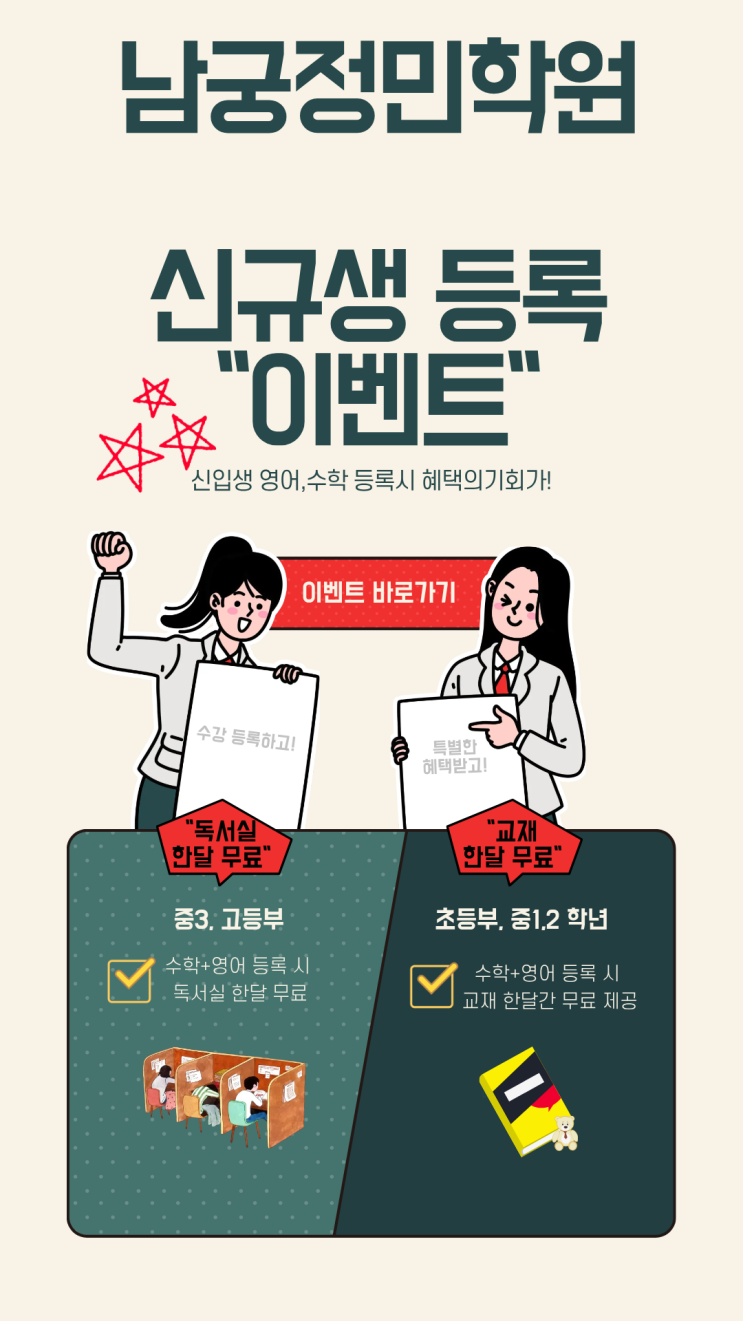 남궁정민학원 신입생을 위한 특별한 시작 "이벤트" **남궁정민학원** 에서는 처음 학원을 선택하는 신입생들이 부담 없이 시작하고, 확실한 학습 효과를 경험할 수 있도록 신입생 전용 특별 이벤트를 진행합니다. 신규생 수강 등록 혜택 안내 ① 초등부 · 중1 · 중2 신입생 수학 · 영어 수강 등록 시 교재 1개월 무료 제공 : 수업에 꼭 필요한 교재를 부담 없이 준비하고 수업 적응부터 학습 흐름까지 안정적으로 시작할 수 있습니다. ② 중3 · 고등부 신입생 수학 · 영어 수강 등록 시 도서실 1개월 무료 이용 : 수업 후 자습까지 연결되는 학습 환경 제공 집중 관리형 독서실로 학습 습관 형성과 자기주도 학습....... <img src="https://blogthumb.pstatic.net/MjAyNjAxMTVfMTYz/MDAxNzY4NDYzNjgyMDk2.Nevi_7vMRCxv87XA8wWhXOJgyUsKJaZheixMzWNJm4Yg.PBlct6wuAaGqzRkCkfoRB0bW6nGojEnUQkvkyBKe7Zsg.PNG/%BD%C5%B1%D4%BB%FD_%B5%EE%B7%CF_%C0%CC%BA%A5%C6%AE.png?type=s3" />