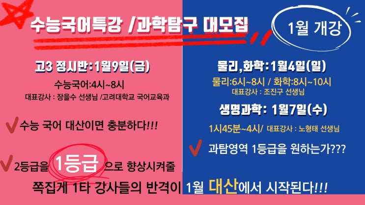 12월 19일(금) 8시30분 수능국어특강 공개 강의!!! 예비고3 원생을 대상으로 수능 국어특강이 1월 9일 시작으로 27수능을 향한 대장정을 시작합니다!!! 고려대학교 국어교육을 전공하신 1타 강사님을 모시고 야심차게 시작하는 수능 국어특강!!! 수강을 원하는 예비고3 원생들이 모집 대상이며, 12월 19일(금) 8시30분에 본원에서 공개 강의가 있을 예정입니다. 순간의 선택이 나의 일생을 좌우합니다. 예비고3 원생들의 많은 참여바랍니다. 원생들의 1년후의 국어 1등급을 받고 뿌듯해 하는 모습을 기대하며 힘찬 출발을 함께 해 봅시다!!! 또한, 예비고2 원생들을 대상으로 과학탐구영역 (생명과학,물리,화학)을 1월에 개강합니다... 25년에 본....... <img src="https://blogthumb.pstatic.net/MjAyNTEyMThfNiAg/MDAxNzY2MDI1MzI3NjY2.fjEMqeBhpa3Z1WFcL-q-9CQ3WG7O2yuxD7ho7pkaG0gg.mT7A8VmD8hnLvHjPRheaY48GNSNvQrHncEx1yY8Yx9sg.JPEG/%C1%A6%B8%F1%C0%BB-%C0%D4%B7%C2%C7%D8%C1%D6%BC%BC%BF%E4_-001_%282%29.jpg?type=s3" />