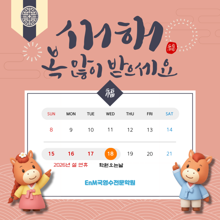Enthusiastic new Method EnM국영수전문학원 은평구 중 고교 내신 + 입시전문 (밀착관리형 학원) 소수정예 1:1 맞춤수업 학생 개인 완벽 커리큘럼 EnM 국영수전문학원 입니다. 2026년 구정 설날이 코앞까지 다가왔습니다! EnM 에 보내주신 관심과 사랑에 감사드리며, 평안이 가득 하시고 새해 복 많이 받으시길 바랍니다. ♀️♂️ 2026 EnM 학원 설 연휴를 안내드립니다. 공통 연휴 2026년 2월 15일 (일) ~ 2026년 2월 17일 (화) 개별 연휴 2026년 2월 18일 (수) 공통 연휴는 모든 EnM 학생들이 연휴 기간동안 쉬는 기간입니다. 개별 연휴는 각 선생님 별 시간표에 따라 2월 18일 수요일 수업을 정상....... <img src="https://blogthumb.pstatic.net/MjAyNjAyMTNfODYg/MDAxNzcwOTgwMTcyNDM0.Trc6b3xq1MkmQb_dAxiesCYV2aMstMpkgrfNc8nKqXYg.A_UDjwYVbY1GhPWU6mcSPv2tYm2pHH-RgO9CTKPovc0g.PNG/2026_%BB%F5%C7%D8.png?type=s3" />