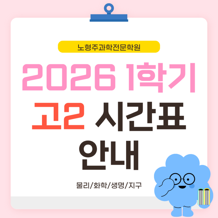안녕하세요, 노형주과학전문학원입니다. 학생들의 개학과 입학이 다가오면서 고2 물화생지 3월 수업 및 학교별 시간표에 대해 많은 학부모님들께서 문의를 주고 계십니다. 이에 공통적으로 궁금해하시는 내용을 정리하여 보다 정확하게 안내드리고자 합니다. 노형주과학전문학원의 3월 고2 물화생지 정규 수업은 3/3(화)부터 시작됩니다. 물화생지 3월 시간표 안내 (3/3 부터 순차적 개강) *각 수업 별 개강일자가 상이하므로 자세한 개강일자는 위 사진을 참고해주세요. 시간표는 변동될 수 있으니 수강 전 학원으로 문의 부탁드립니다 :) 영상대체 수업 역시 정규수업과 동일하게 수강료가 산정되므로, 참고 부탁드립니다! 클리닉 수업 운영 클....... <img src="https://blogthumb.pstatic.net/MjAyNjAyMjBfMTEz/MDAxNzcxNTgyMjMxMDEx.qVSfebJTVsUcP-VctwbIey2QJ1XdxGWxRkGqH-7U4w0g.QQe9l-6bHc-qA78UTYL7HngPyjEOXsg6gZzTYHGw0VMg.PNG/1.png?type=s3" />