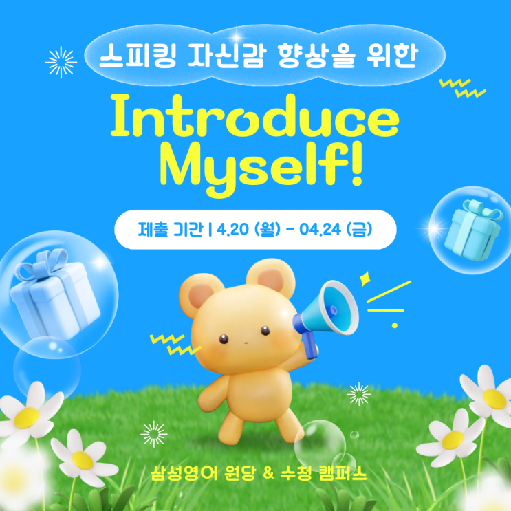 스피킹 자신감 향상 프로젝트 삼성영어 원당 & 수청캠퍼스 Introduce Myself! 자기소개 스피킹 이벤트 안내 안녕하세요. 삼성영어 원당캠퍼스 & 수청학원입니다. 아이들이 영어를 배우면서 가장 어려워하는 부분 중 하나는 바로 ‘영어로 말하기’입니다. 읽고 쓰는 것은 익숙해도 막상 “영어로 나를 소개해보자”라고 하면 망설이게 되는 경우가 많습니다. 그래서 저희 원당 & 수청캠퍼스에서는 아이들의 스피킹 자신감 향상을 위해 특별한 이벤트를 준비했습니다. Introduce Myself! 이벤트란? 이번 이벤트는 아이들이 학원에서 배운 자기소개 내용을 바탕으로 스스로 정리하고 충분히 연습한 뒤 영어로 직접 말하는 영상까지 촬....... <img src="https://blogthumb.pstatic.net/MjAyNjA0MTVfMjk5/MDAxNzc2MjE1ODk0Mjgw.4e043FaXuTTth59Z4K1M46tyqneDtSZuWm6eRdg7xo0g.tPkR8NVG3_10N9BecqCblJYmRpkfJSIFLhqEJG-IUs4g.PNG/KakaoTalk_20260408_142315289.png?type=s3" />