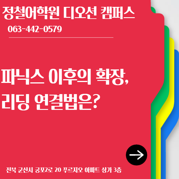 안녕하세요 구암동파닉스 정철어학원 디오션캠퍼스 입니다. 파닉스를 마친 뒤에도 영어가 더 이상 늘지 않는다고 느끼는 경우가 많습니다. 소리는 읽을 수 있는데 문장이 잘 보이지 않는 단계입니다. 이 시점에서 중요한 것이 바로 리딩으로의 자연스러운 확장입니다. 파닉스 이후의 방향이 영어 실력을 결정하게 됩니다. 파닉스는 영어의 출발점이지 목표는 아닙니다. 소리와 글자를 연결했다면 이제는 문장과 의미를 함께 이해해야 합니다. 리딩으로 연결되지 않으면 파닉스는 단순 기술에 머무를 수밖에 없습니다. 그래서 파닉스 이후에는 읽기 중심 학습이 필요합니다. 리딩 연결의 첫 단계는 짧은 문장을 반복해서 읽는 경험을 만드는 것입....... <img src="https://blogthumb.pstatic.net/MjAyNjAxMDZfMjg0/MDAxNzY3Njc1MDc0NDQ3.IrYJuPGfIy6eXQa2Xgzfh6HK4vr_bEVHBmL5B6vBEvQg.SlqZs52oYzwf4IJW_D9_4yx9RgrKitdLqgNB2oSI5rIg.PNG/image.png?type=s3" />
