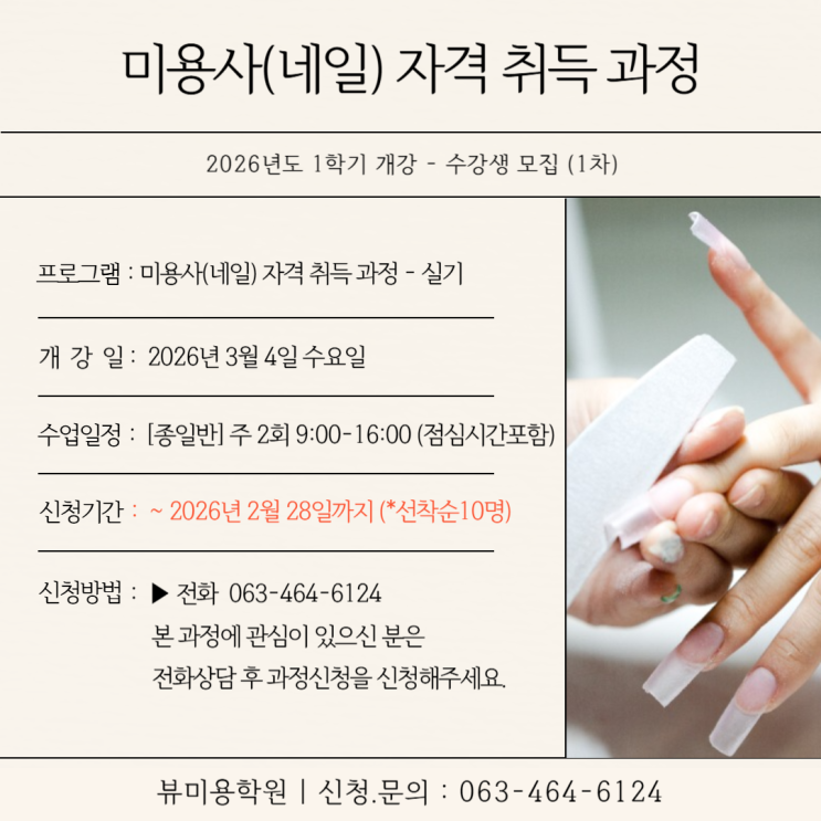 군산 미용학원 국비지원 [뷰미용학원] 네일국가자격증 취득|3월 개강 수강신청 안내